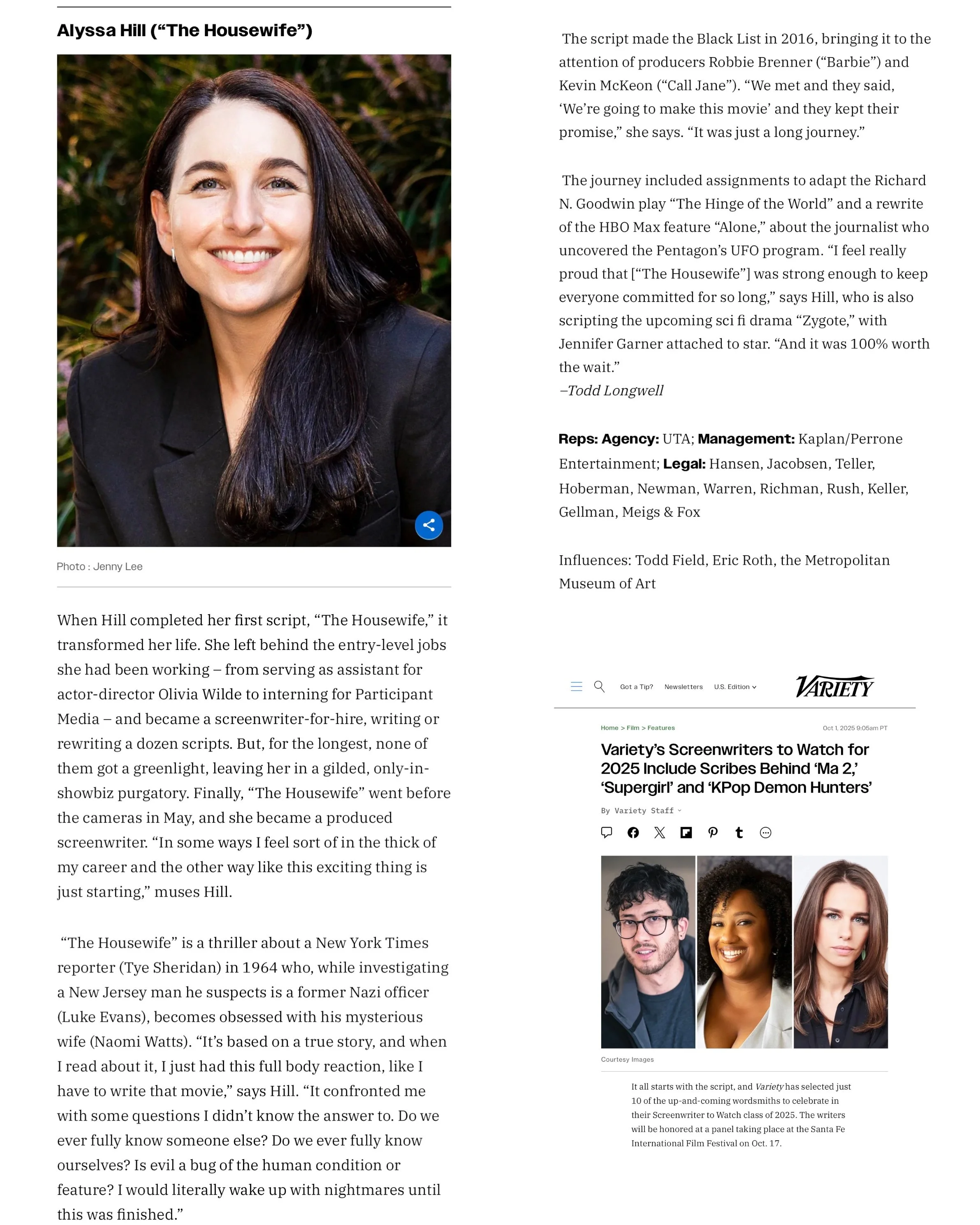 Variety has selected Alyssa as one of their Screenwriters to Watch Class of 2025 — celebrating just 10 incredible up-and-coming voices shaping the future of storytelling. She’ll be honored at a panel during the Santa Fe International Film Festival on October 17.